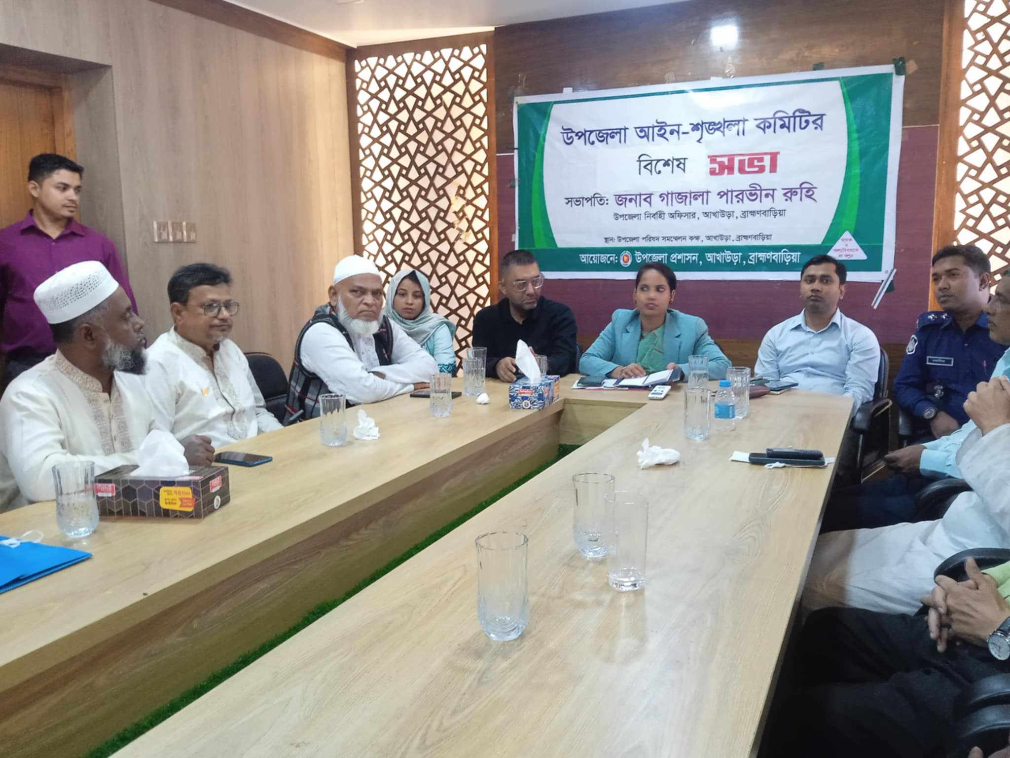 চলমান ইসকন ইস্যুতে ব্রাহ্মণবাড়িয়ার আখাউড়ায় উপজেলা প্রশাসনের আয়োজনে বিশেষ সভা অনুষ্ঠিত হয়েছে। বৃহস্পতিবার দুপুরে উপজেলা সম্মেলন কক্ষে সভায় প্রশাসনের কর্মকর্তা, রাজনীতিবিদ, শিক্ষক, সাংবাদিক, আলেম ওলামা ও হিন্দু সম্প্রদায়ের প্রতিনিধিরা উপস্থিত ছিলেন।