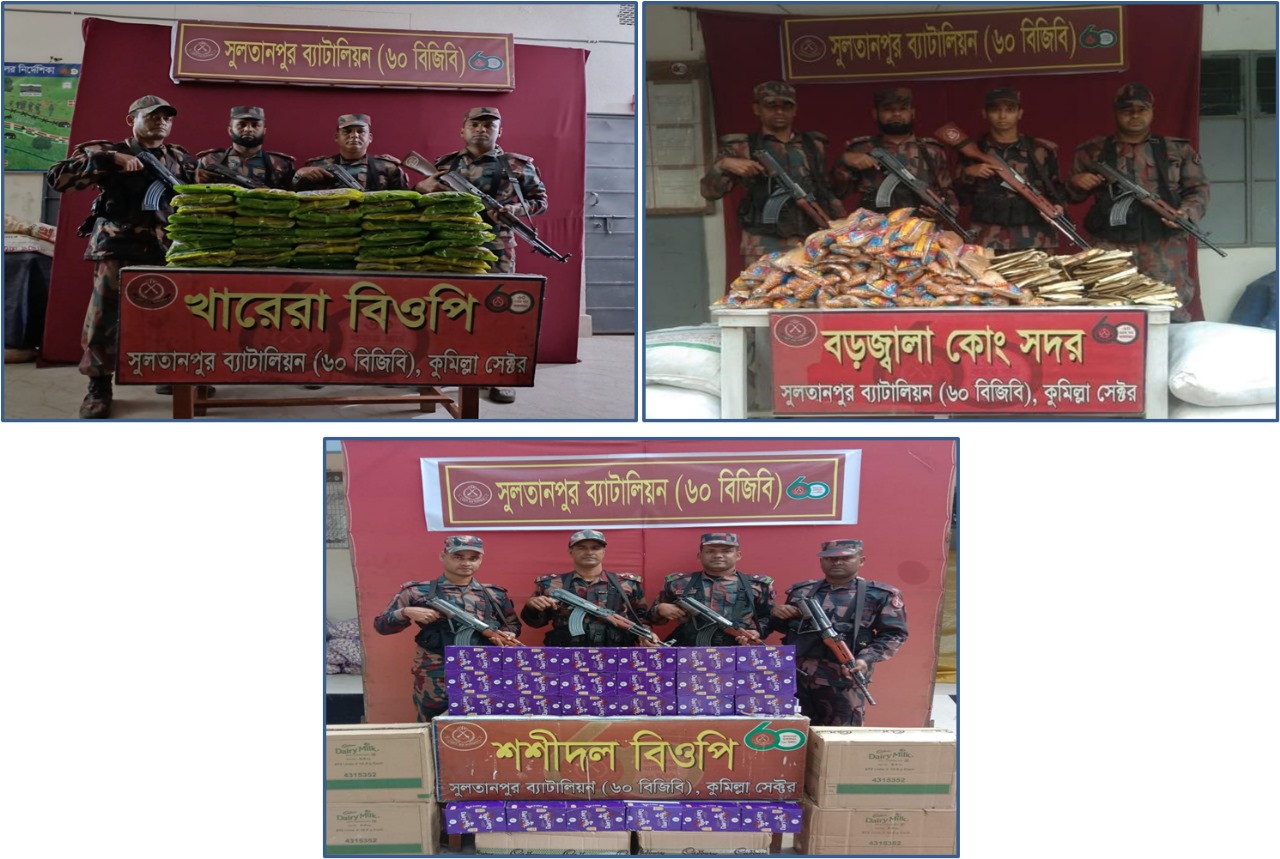 বিজিবি জানায়, সুলতানপুর ব্যাটালিয়ন (৬০ বিজিবি) এর দায়িত্বপূর্ণ এলাকার কুমিল্লা জেলার সীমান্তবর্তী ব্রাহ্মণপাড়া ও বুড়িচং উপজেলার সীমান্ত হতে শংকুচাইল, শশীদল, সালদানদী, খারেরা ও বড়জ্বালা বিওপি এবং ব্রাহ্মণবাড়িয়া জেলার সীমান্তবর্তী আখাউড়া ও কসবা উপজেলার সীমান্ত হতে ঘাগুটিয়া, কসবা, চন্ডিদার ও মাদলা বিওপি কর্তৃক ১০ জানুয়ারি ২০২৫ হতে ১৪ জানুয়ারি ২০২৫ তারিখ পর্যন্ত মাদক ও চোরাচালান বিরোধী অভিযান পরিচালনা করে ৪৫,৮৯,০৬০/-(পয়ঁতাল্লিশ লক্ষ ঊননব্বই হাজার ষাট) টাকা মূল্যের বিপুল পরিমান ভারতীয় অবৈধ মাদক ও বিভিন্ন প্রকার মালামাল জব্দ করা হইয়াছে । তন্মধ্যে জব্দকৃত কসমেটিক্স সামগ্রী ৭৭১ পিস, কিসমিস ২১ কেজি, গরু ০৯ টি, চকলেট ৬৩২৮ পিস, চিনি ৪,৭৫৭ কেজি, চুলের তেল ৪৪৯ বোতল, ডব্লিউপি পাপা কিটনাশক ৩৯৮ পিস, তালা ৯০৬ পিস, ফুচকা ৮৬ কেজি, বডি ওয়েল ১৮ বোতল, বাঁজি ৬৩,০০০ পিস, বাংলাদেশী রসুন ১১৭ কেজি, বাসমতি চাউল ২১৩ কেজি, মোটরসাইকেল ০১টি, সেমাই ৫১৬ প্যাকেট, হুইস্কি ১৯২ বোতল, বিয়ার ১১ বোতল, গাঁজা ০৫ কেজি এবং ইস্কফ সিরাপ ৫৫ বোতল।