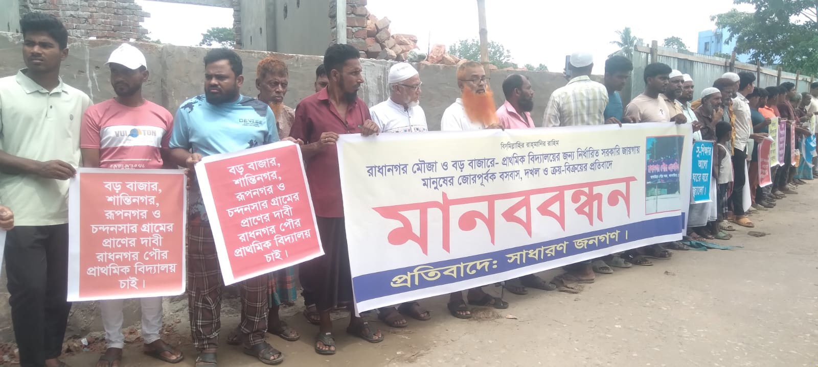 এলাকাবাসীর দাবি, কয়েক বছর আগে এখানে সাইনবোর্ড টানিয়ে পৌর প্রাথমিক বিদ্যালয় করার ঘোষণা দেন তৎকালীন মেয়র। জায়গাটি সরকারি খাস খতিয়ানের উল্লেখ করে সেখানে বিদ্যালয় করার দাবিতে মানববন্ধন করেন এলাকাবাসী। একইসঙ্গে প্রশ্ন তুলেছেন, কে বা কারা কি কারণে সাইনবোর্ড সরিয়ে ফেলেছেন।
