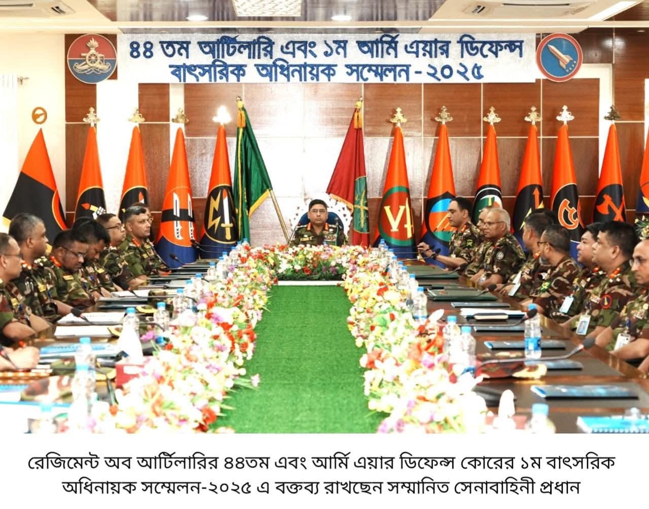 ঢাকা, ৩০ অক্টোবর ২০২৫ (বৃহস্পতিবার): আজ (৩০ অক্টোবর ২০২৫) চট্টগ্রামের হালিশহর সেনানিবাসস্থ আর্টিলারি সেন্টার এন্ড স্কুল (এসিএন্ডএস)-এ রেজিমেন্ট অব আর্টিলারির ৪৪তম এবং আর্মি এয়ার ডিফেন্স কোরের ১ম বাৎসরিক অধিনায়ক সম্মেলন ২০২৫ অনুষ্ঠিত হয়। এই সম্মেলনে প্রধান অতিথি হিসেবে উপস্থিত ছিলেন সেনাবাহিনী প্রধান জেনারেল ওয়াকার-উজ-জামান, এসবিপি, ওএসপি, এসজিপি, পিএসসি। সেনাবাহিনী প্রধান এসিএন্ডএস-এ পৌঁছালে তাঁকে জিওসি, আর্মি ট্রেনিং এন্ড ডকট্রিন কমান্ড; জিওসি, ২৪ পদাতিক ডিভিশন ও এরিয়া কমান্ডার, চট্টগ্রাম এরিয়া এবং কমান্ড্যান্ট, এসিএন্ডএস অভ্যর্থনা জানান।