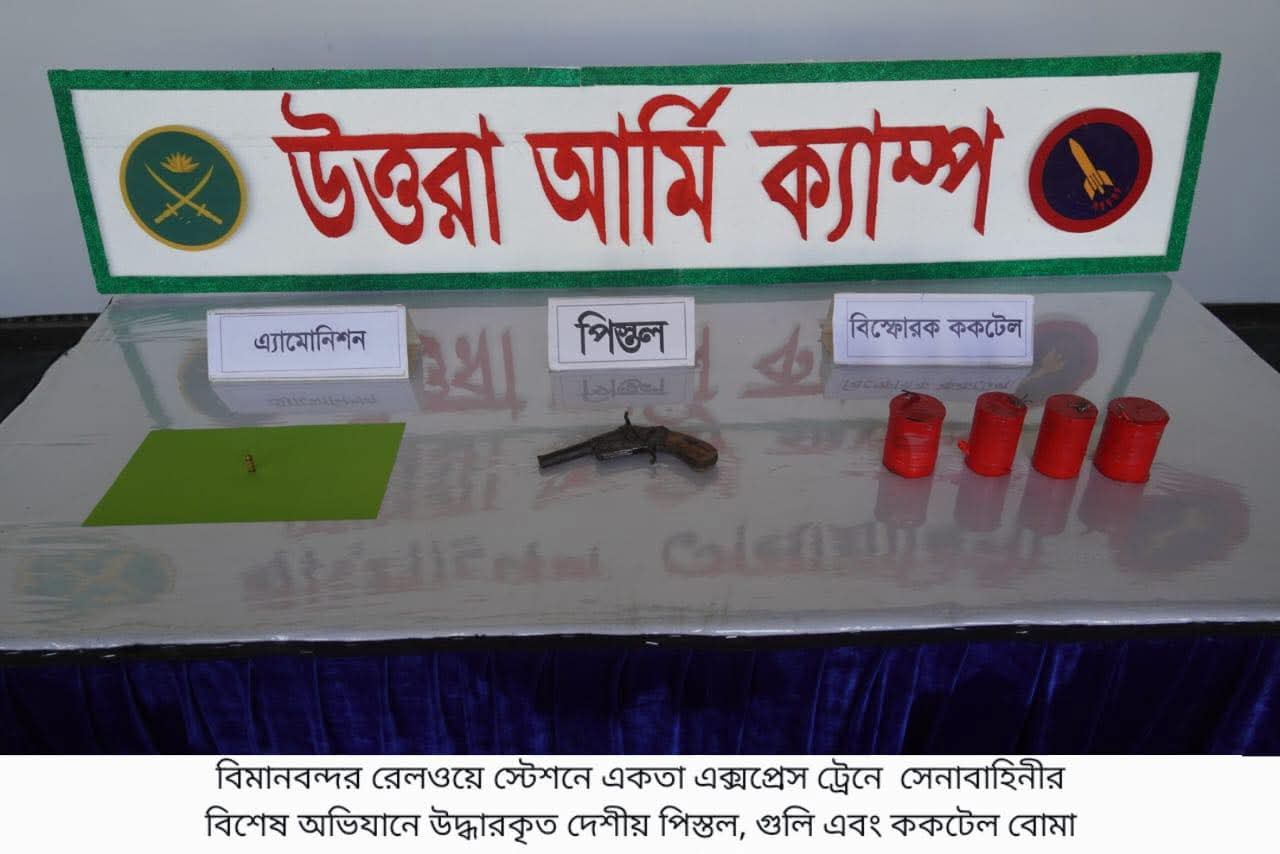 ঢাকা, ১৭ নভেম্বর ২০২৫ (সোমবার): আজ সকাল ৮ টায় বাংলাদেশ সেনাবাহিনীর ৬ স্বতন্ত্র এডি ব্রিগেডের অধিনস্থ উত্তরা আর্মি ক্যাম্প থেকে সুনির্দিষ্ট তথ্যের ভিত্তিতে রাজধানীর বিমানবন্দর রেলওয়ে স্টেশনে একটি বিশেষ অভিযান পরিচালনা করা হয়। অভিযানে দিনাজপুর থেকে ছেড়ে আসা একতা এক্সপ্রেস ট্রেনের বেশ কয়েকটি বগি তল্লাশি করে চালের বস্তা থেকে ০১ টি দেশীয় পিস্তল, ০১ রাউন্ড অ্যামুনিশন এবং ০৪ টি ককটেল বোমা উদ্ধার করা হয় । উক্ত ঘটনার সঙ্গে জড়িত থাকার সন্দেহে চারজন ব্যক্তিকে প্রাথমিক জিজ্ঞাসাবাদের জন্য উত্তরা আর্মি ক্যাম্পে নিয়ে আসা হয়। এছাড়াও প্রত্যক্ষদর্শিরা উল্লেখ করেন দিনাজপুর থেকে ছেড়ে আসার পর পার্বতীপুর রেলষ্টেশনে ট্রেনটি যাত্রা বিরতি নিলে ০৩/০৪ জন ব্যক্তি কয়েকটি চালের বস্তা (লুকায়িত পিস্তল এবং বিস্ফোরক দ্রব্যাদিসহ) ট্রেনের নির্দিষ্ট বগিতে রেখে চলে যায়। উক্ত ঘটনার সাথে সংশ্লিষ্ট নাশকতাকারীদের সনাক্তকরণের কার্যক্রম চলমান রয়েছে।বাংলাদেশ সেনাবাহিনী জননিরাপত্তা, আইনশৃঙ্খলা ও জাতীয় নিরাপত্তা রক্ষায় সর্বদা অঙ্গীকারবদ্ধ। সন্ত্রাস, নাশকতা ও অপরাধ দমনে এ ধরনের সমন্বিত অভিযান ভবিষ্যতেও অব্যাহত থাকবে ।