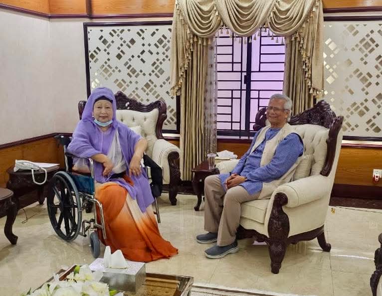 ঢাকা, ২১ নভেম্বর ২০২৫: আজ শুক্রবার রাজধানীর সেনানিবাসে সশস্ত্র বাহিনী দিবস উপলক্ষে আয়োজিত অনুষ্ঠানের সাইডলাইনে প্রধান উপদেষ্টা প্রফেসর মুহাম্মদ ইউনূস ও বিএনপি চেয়ারপার্সন বেগম খালেদা জিয়া পারষ্পরিক সৌজন্য বিনিময় করেন। প্রধান উপদেষ্টা এসময় সাবেক প্রধানমন্ত্রী বেগম খালেদা জিয়ার বর্তমান শারীরিক অবস্থার বিষয়ে খোঁজ নেন এবং তাঁর সুস্থতা কামনা করেন।বিএনপি চেয়ারপার্সন খালেদা জিয়া প্রধান উপদেষ্টাকে ধন্যবাদ জানান। তিনি প্রধান উপদেষ্টার সহধর্মিণী আফরোজী ইউনূসের শারীরিক অবস্থার খোঁজ নেন এবং শুভকামনা জানান। এসময় খালেদা জিয়ার কনিষ্ঠ পুত্রবধূ সৈয়দা শর্মিলা রহমান উপস্থিত ছিলেন।