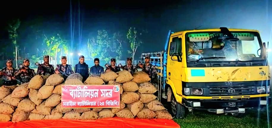 ভারত থেকে পণ্য আসার তালিকায় প্রতিনিয়তই যোগ হচ্ছে নতুন নাম। এবার আলু আসার খবর পাওয়া গেল। ১১ ঘণ্টার ব্যবধানে দুটি পৃথক অভিযানে প্রায় ৬ টন ভারতীয় আলু জব্দ করেছে বিজিবিশনিবার বিকেলে ও রবিবার (২৩ নভেম্বর) ভোরে ব্রাহ্মণবাড়িয়ার বিজয়নগর উপজেলা থেকে এসব পণ্য জব্দ করা হয়জেলার সরাইলে অবস্থিত বিজিবি ২৫ ব্যাটালিয়ন এসব পণ্য জব্দ করে। এসময় দু’জনকে আটক ও একটি পিকআপ জব্দ করা হয়।চান্দুরা থেকে প্রায় পাঁচ হাজার কেজি আলুসহ আটককৃতরা হলো, সিলেটের গোয়াইনঘাট উপজেলার রাধানগর বাজারের মো. মারুফ আহমেদ (১৯) ও গাজীপুরের টঙ্গীর মো. জীবন হক (২৪) তাদের বিরুদ্ধে মামালা দায়ের করে বিজয়নগর থানায় সোপর্দ করা হয়েছে।বিজিবি-২৫ ব্যাটালিয়নের অধিনায়ক লে. কর্নেল জব্বার আহমেদ এ তথ্য নিশ্চিত করেছেন। তিনি জানান, ২৫ ব্যাটালিয়নের আরেকটি অভিযানে হবিগঞ্জের মাধবপুর উপজেলা থেকে মোবাইল ফোন ও ডিসপ্লে উদ্ধার করা হয়। তিনি জানান, গত দুই দিনে প্রায় ৯৪ লাখ টাকার ভারতীয় পণ্য জব্দ করা হয়েছে।বিজিবি সূত্র জানায়, রবিবার ভোর পৌনে ৫টার দিকে বিজয়নগর উপজেলার ইসলামপুর থেকে ৬৬১ কেজি আলু মালিকবিহীন অবস্থায় উদ্ধার করা হয়।এসময় পাঁচটি ভারতীয় কম্বলও জব্দ করা হয়। এসব পণ্যের মূল্য প্রায় এক লাখ ৪০ হাজার টাকা। শনিবার সন্ধ্যা পাঁচটায় পৃথক অভিযানে চান্দুরা এলাকায় একটি পিকআপ থেকে পাঁচ হাজার ২৩৭ কেজি আলু জব্দ করা হয়। এসব পণ্যের মূল্য প্রায় ২১ লাখ টাকা। এদিকে শনিবার রাত সাড়ে ১২টার দিকে হবিগঞ্জের মাধবপুর উপজেলার আলীনগর থেকে ২৩২ পিস মোবাইল ফোন, ৩১ পিস মোবাইল ফোন ডিসপ্লে ও ১৯ পিস ফোনের ব্যাক কাভার জব্দ করা হয়।