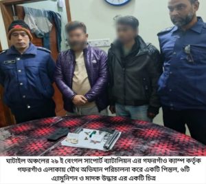 ঢাকা, ০৩ জানুয়ারি ২০২৬ (শনিবার): গতকাল রাত আনুমানিক ১০ টায় চাঁদপুর জেলার শাহরাস্তি উপজেলার পশ্চিম উপলতা এলাকায় সুনির্দিষ্ট গোয়েন্দা তথ্যের ভিত্তিতে সেনাবাহিনীর নেতৃত্বে যৌথ অভিযান পরিচালনা করে ২টি পিস্তল, ৩টি ম্যাগাজিন, ৩০ রাউন্ড পিস্তলের এ্যামোনিশন, ১টি গ্যাস মাস্ক, ১টি হার্ড ড্রাইভ এবং ১টি হোলস্টারসহ ২ জনকে গ্রেফতার করা হয়। অন্যদিকে পৃথক একটি অভিযানে ময়মনসিংহ জেলার গফরগাঁও উপজেলার বলাইবাড়ি এলাকা থেকে গতকাল রাত আনুমানিক ১১ টায় ১টি পিস্তল, ৬ রাউন্ড বিভিন্ন ধরনের এ্যামোনিশন, ইয়াবা এবং হেরোইনসহ ২ জনকে গ্রেফতার করা হয়। বাংলাদেশ সেনাবাহিনী সর্বসাধারণের নিরাপত্তা নিশ্চিত করতে বদ্ধপরিকর। যেকোন অপরাধমূলক কর্মকান্ডের তথ্য নিকটস্থ সেনা ক্যাম্প অথবা আইন-শৃঙ্খলা বাহিনীর নিকট প্রদান করতে সকলকে অনুরোধ জানানো যাচ্ছে।
