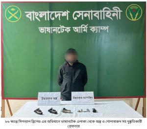 ঢাকা, ০৪ জানুয়ারি ২০২৬ (রবিবার) : গত ০৩ জানুয়ারি রাত আনুমানিক সাড়ে ১০ টায় সুনির্দিষ্ট গোয়েন্দা তথ্যের ভিত্তিতে বাংলাদেশ সেনাবাহিনীর একটি অভিযান দল ঢাকার ভাষানটেক এলাকায় অভিযান পরিচালনা করে মো: সুমন (৪৫) নামের একজন ব্যক্তিকে ০১টি পিস্তল, ০২ টি রিভলবার, ০২টি ম্যাগাজিন ও ০৭ রাউন্ড তাজা গুলিসহ গ্রেপ্তার করে।