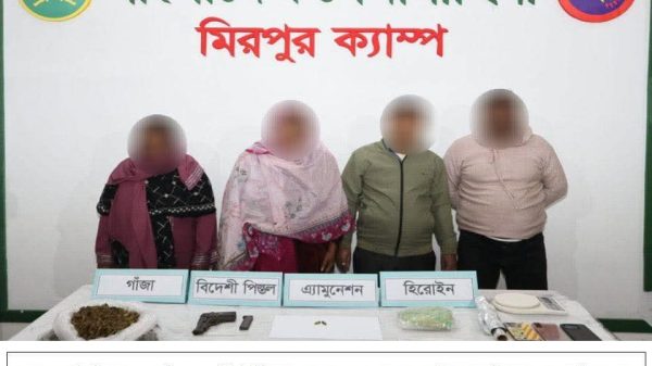 চাঁদপুর ও ময়মনসিংহ জেলায় পৃথক অভিযানে বিদেশী অস্ত্র এবং গোলাবারুদ উদ্ধারঃ গ্রেফতার ৪ জন
