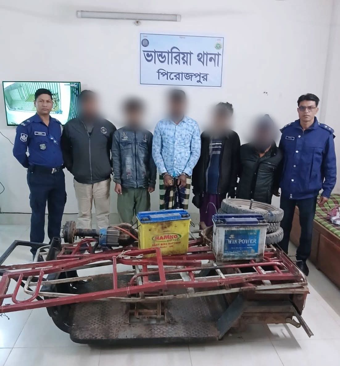 পিরোজপুর জেলার সুযোগ্য পুলিশ সুপার জনাব মোহাম্মদ মনজুর আহমেদ সিদ্দিকী মহোদয়ের দিক-নির্দেশনায়, অতিরিক্ত পুলিশ সুপার (ক্রাইম এন্ড অপস্) জনাব মো: জিয়াউর রহমান এর তদারকিতে, ভান্ডারিয়া অফিসার ইনচার্জ জনাব দেওয়ান জগলুল হাসান এর নেতৃত্বে ভান্ডারিয়া থানার অফিসার ও ফোর্সের সমন্বয়ে একটি চৌকস টিম গঠন করা হয়। গত ০৮/০১/২৬ খ্রি: জনৈক সাইফুল আলম শিকদার (৩৮), পিতা- ফারুক শিকদার, মাতা - সাহেরা বেগম, গ্রাম -গৌরীপুর, ভান্ডারিয়া, পিরোজপুর এর ব্যাটারি চালিত অটো গাড়িটি চুরি হয়ে যায়। এ বিষয়ে গতকাল রাতে তিনি থানায় অবগত করলে প্রথমে অভিযান পরিচালনা করে গাড়ি চোর মোঃ রায়হান জোমাদ্দারকে গ্রেফতার করা হয়। তার দেয়া তথ্য মোতাবেক ভান্ডারিয়া থানাধীন মহিলা কলেজে এলাকা থেকে অভিযান পরিচালনা করে আরো চারজনকে গ্রেফতার করা হয়। তাদের নিকট থেকে গাড়ির ব্যাটারিসহ চুরি করা অটো (যা পরবর্তীতে কেটে ফেলা হয়েছে) উদ্ধার করা হয়