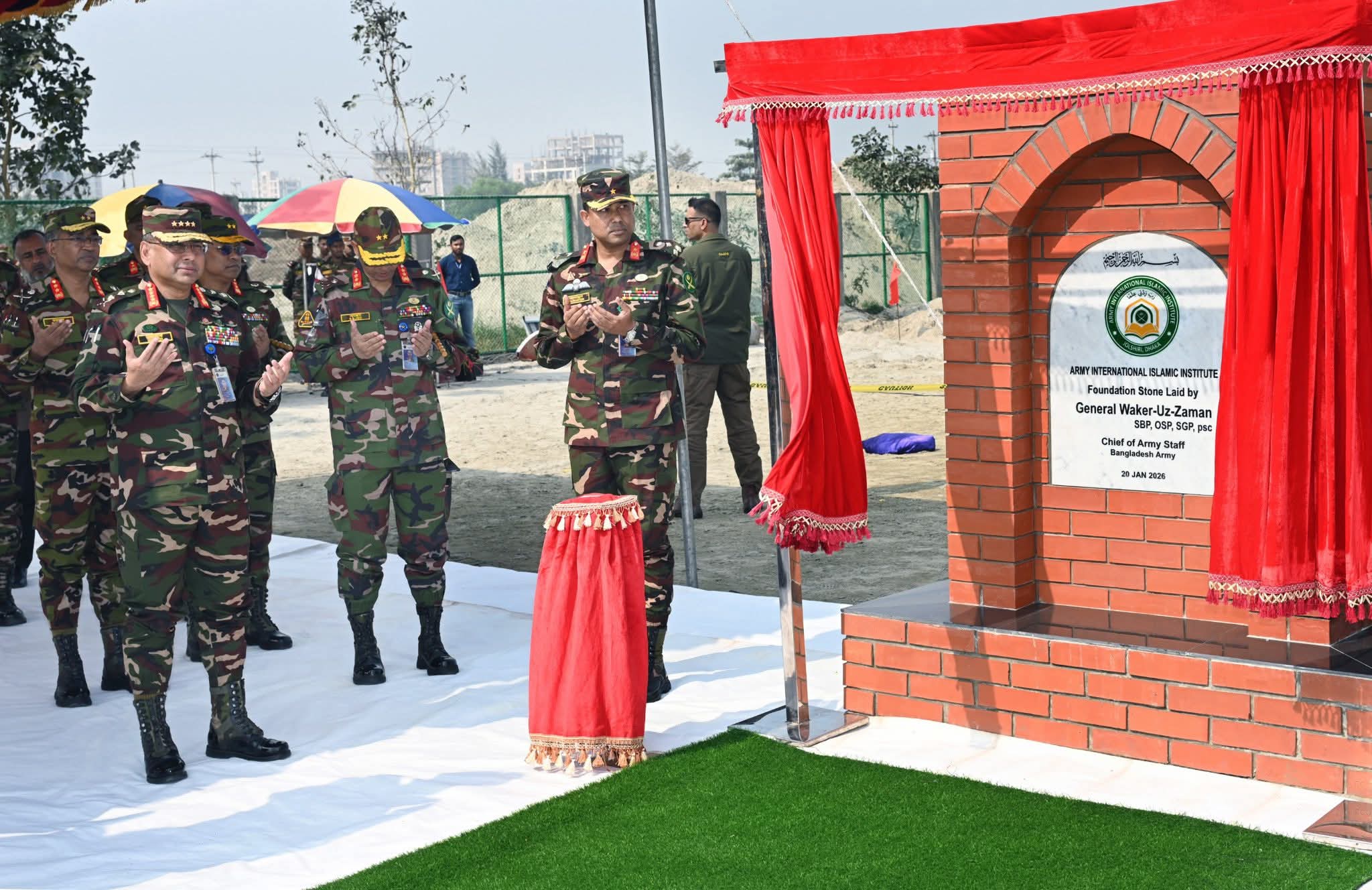 ঢাকা, ২০ জানুয়ারি ২০২৬ (মঙ্গলবার): আজ সম্মানিত সেনাবাহিনী প্রধান জেনারেল ওয়াকার-উজ-জামান, এসবিপি, ওএসপি, এসজিপি, পিএসসি রাজধানীর জলসিঁড়ি আবাসন প্রকল্প এলাকায় আর্মি ইন্টারন্যাশনাল ইসলামিক ইনস্টিটিউট 'A Triple I' এর ভিত্তিপ্রস্তর স্থাপন করেন। অনুষ্ঠানে সেনাসদর ও লজিস্টিকস এরিয়ার ঊর্দ্ধতন কর্মকর্তাগণ উপস্থিত ছিলেন।