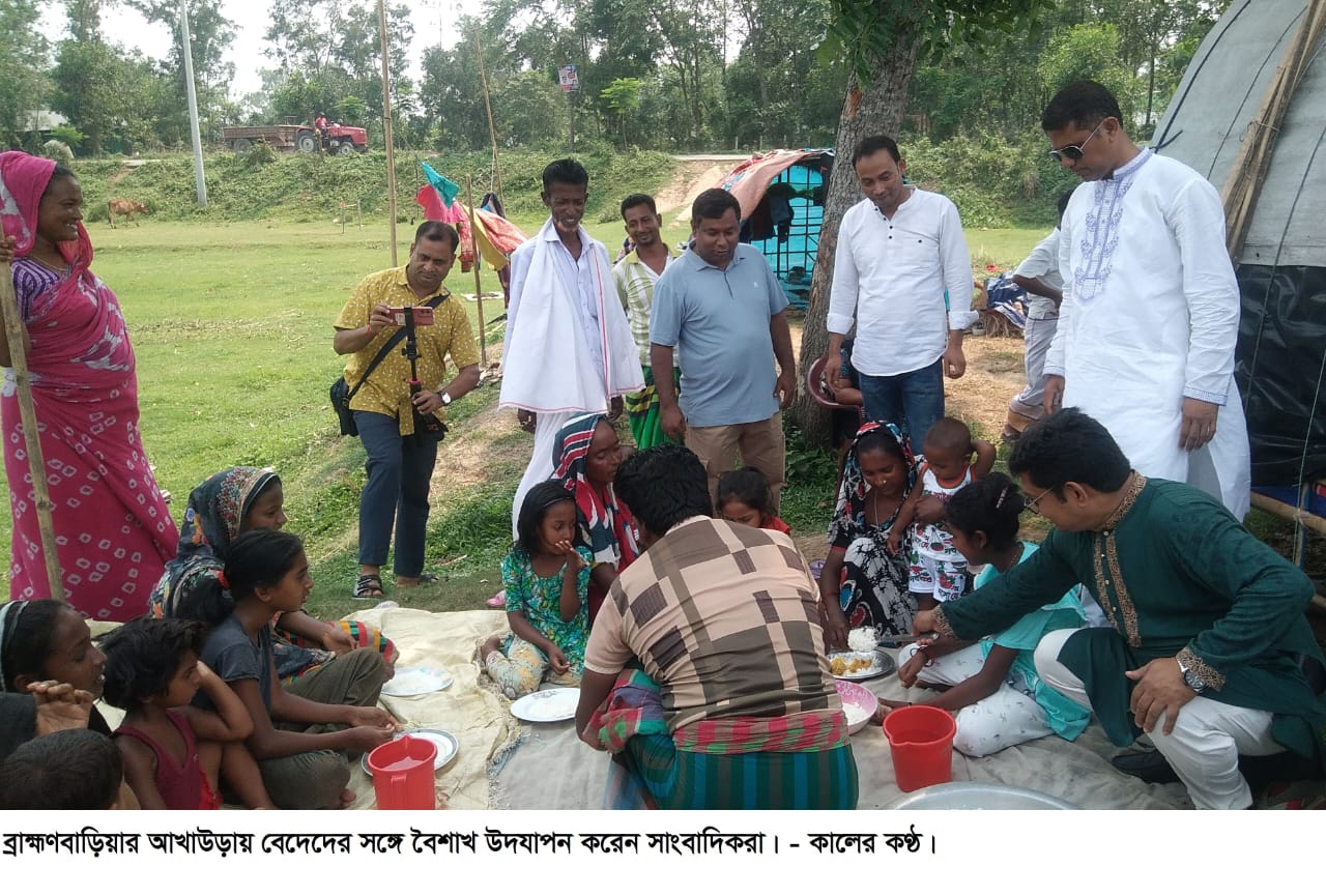 নিজেদের মধ্য কি যেন বলাবলি করলেন তিন-চার বেদে। হাতের ইশারা দেখে বুঝা গেলো আমাদের বসার জায়গাটা ঠিকঠাক করতে। তবে সাংবাদিকরা জানালেন, বসতে নয় তাদের সঙ্গে বৈশাখের আনন্দ উপভোগ করতে এসেছে।বেদে সর্দার বের করে নিয়ে এলেন বিষধর একটি সাপ, কালো রংয়ের। আরো আনা হলো দু’টি। দেখানো হলো সাপের খেলা। সাংবাদিকদের কেউ কেউ ভয়ে একটু দূরে। কেউবা সাহস করে ভিডিও করলেন, ছবি তুললেন।পহেলা বৈশাখে এমন আয়োজন ব্রাহ্মণবাড়িয়ার আখাউড়ায়। সাংবাদিকরা দুপুরে ঘন্টাখানেকের বেশি সময় কাটান বেদে পরিবারেরে সঙ্গে। বেদেদের বাস্তব জীবনের অভিজ্ঞতা শুনেন সাংবাদিকরা। নিজেদের নানা বিষয় নিয়েও কথা বলেন। আখাউড়া প্রেস ক্লাবের উদ্যোগে বাইপাস এলাকার অস্থায়ী বেদে পল্লীতে এ আয়োজন করা হয়। বেদের জন্য খাবারের আয়োজন করে প্রেসক্লাব। ১২টি পরিবারের ৪০ জন সদস্য খাবার গ্রহন করে। এ আয়োজনকে তারা স্বাগত জানান। বাইপাস রোডে অবস্থানরত বেদে মো. রাসেল জানায়, তাদের খুব ভালো লাগছে। সাংবাদিকরা তাদের জন্য খাবারের আয়োজন করেছে। পছন্দ মতো খাবারের সব আয়োজন তারা কিনে দেয়। তাদের এখানেই রান্না করা হয়।বেদে সর্দার মো. হারুন বলেন, ‘পহেলা বৈশাখে সাপ খেলা দেখাতে আমাদের ডাক পড়ে। তবে এভাবে কেউ এসে খাবারের আয়োজন করে না। আমরা খুব আনন্দিত। সাংবাদিকরা আমাদের নানা বিষয় নিয়ে আলোচনা করে। আমরা আমাদের কষ্টের কথা তাদের কাছে তুলে ধরেছি।পৌর যুবদলের সদস্য সচিব মো. হুমায়ুন রহমান নয়ন বলেন, 'সাংবাদিকদের এমন আয়োজনের কথা শুনে তাদের সঙ্গে বেদে পল্লীতে চলে আসি। খুব ভালো লেগেছে এ ধরণের ব্যতিক্রম আয়োজনটা। এ ধরণের আয়োজনের জন্য সাংবাদিকদেরকে ধন্যবাদ জানাই।আখাউড়া প্রেস ক্লাবের সাধারন সম্পাদক মো. নুরুন্নবী ভ‚ঁইয়া বলেন, ‘আমরা লেখালেখির পাশাপাশি সমাজের দরিদ্র মানুষকে সহায়তা করি। এবার মনে হলো বেদে পরিবারের সঙ্গে বৈশাখ উদযাপন করি। সেই ইচ্ছা থেকেই ৪০জন বেদের জন্য তাদের ইচ্ছা মতো খাবারের আয়োজন করি। আমরা বেদে পল্লীতে গিয়ে সাপ খেলা দেখি। তাদের জীবনের সুখ দুখের কথা শুনি।’