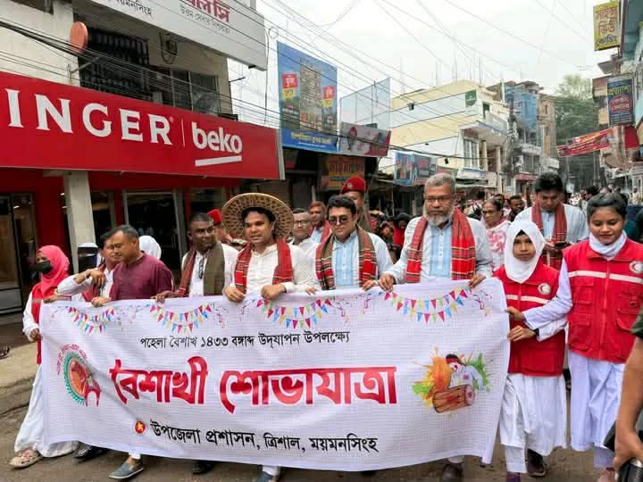 ময়মনসিংহের ত্রিশালে উৎসবমুখর পরিবেশে উদযাপিত হয়েছে বাংলা নববর্ষ ১৪৩৩। পহেলা বৈশাখ উপলক্ষে উপজেলা প্রশাসনের উদ্যোগে দিনব্যাপী নানা কর্মসূচির আয়োজন করা হয়।উপজেলার দুখুমিয়া বিদ্যানিকেতন মাঠে অনুষ্ঠিত এ আয়োজনের অন্যতম আকর্ষণ ছিল বৈশাখী শোভাযাত্রা। রঙিন সাজে সজ্জিত এই শোভাযাত্রায় অংশ নেন বিভিন্ন শিক্ষাপ্রতিষ্ঠানের শিক্ষার্থী, সাংস্কৃতিক সংগঠনের সদস্য এবং স্থানীয় সর্বস্তরের মানুষ। এতে পুরো এলাকায় উৎসবের আমেজ ছড়িয়ে পড়ে।