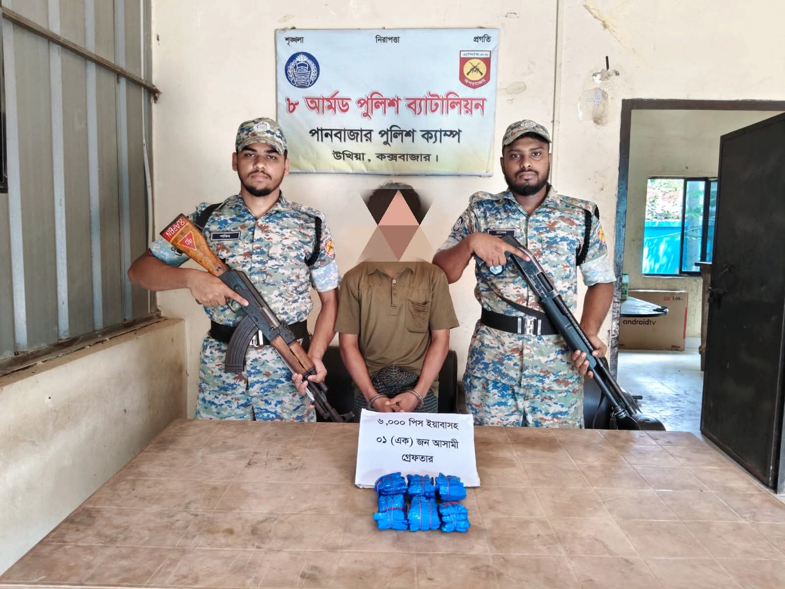 কক্সবাজারের উখিয়া থানাধীন ৮ এপিবিএন-এর পানবাজার পুলিশ ক্যাম্প-০৯ এর চেকপোস্টে তল্লাশি চালিয়ে ৬,০০০ পিস ইয়াবা সাদৃশ্য ট্যাবলেটসহ এক রোহিঙ্গা যুবককে গ্রেফতার করা হয়েছে৮ এপিবিএন মিডিয়া সেলের সূত্রে জানা যায়, বৃহস্পতিবার (২৩ এপ্রিল ২০২৬) সকাল আনুমানিক ৭টার দিকে চেকপোস্ট-০৯ এ ডিউটি পালনকালে সন্দেহজনকভাবে এক ব্যক্তিকে একটি ব্যাগসহ দ্রুত পালানোর চেষ্টা করতে দেখা যায়। এ সময় দায়িত্বরত পুলিশ সদস্যরা তাকে আটক করেনপরে জিজ্ঞাসাবাদে সন্তোষজনক উত্তর দিতে ব্যর্থ হওয়ায় তার দেহ ও সঙ্গে থাকা ব্যাগ তল্লাশি করা হয়। তল্লাশীকালে লাল রঙের একটি শপিং ব্যাগের ভেতর থাকা নীল পলিপ্যাক থেকে ৬,০০০ পিস ইয়াবা সাদৃশ্য ট্যাবলেট উদ্ধার করা হয়উপস্থিত স্থানীয় দোকানদার ও সাক্ষীদের সামনে জিজ্ঞাসাবাদে ধৃত ব্যক্তির পরিচয় নিশ্চিত করা হয়। তিনি নুরুল হক (২০), পিতা: সৈয়দ আমিন; এফসিএন নম্বর-১১২৩৯৩; ঠিকানা: ক্যাম্প-০৯, ব্লক-বি/০৭, বালুখালী-১, উখিয়া, কক্সবাজার।উদ্ধারকৃত ইয়াবা ট্যাবলেট জব্দতালিকা প্রস্তুতপূর্বক জব্দ করা হয়েছে এবং গ্রেফতারকৃত আসামির বিরুদ্ধে উখিয়া থানায় নিয়মিত মামলা দায়েরের প্রক্রিয়া চলমান রয়েছে।৮ এপিবিএন-এর অধিনায়ক জনাব রিয়াজ উদ্দিন আহম্মেদ, পিপিএম-এর দিকনির্দেশনায় এ অভিযান পরিচালিত হয়। সংশ্লিষ্ট কর্তৃপক্ষ জানিয়েছে, মাদকবিরোধী অভিযান অব্যাহত থাকবে।
