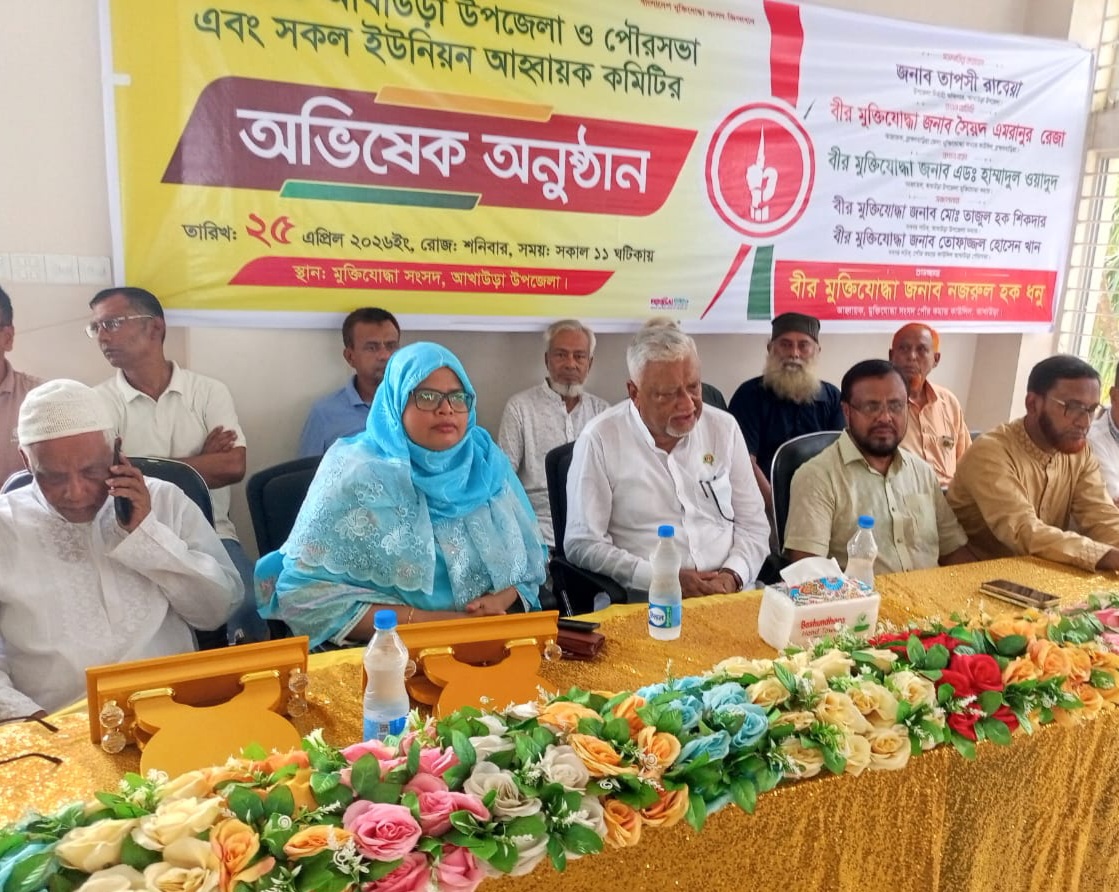 ব্রাহ্মণবাড়িয়ার আখাউড়ায় উপজেলা মুক্তিযোদ্ধা সংসদ, পৌর কমান্ড ও ইউনিয়ন মুক্তিযোদ্ধা সংসদের নতুন কমিটির অভিষেক অনুষ্ঠান শনিবার দুপুরে অনুষ্ঠিত হয়েছে। এ সময় সবাই মিলে একসঙ্গে কাজ করার প্রত্যয় ব্যক্ত করা হয়আখাউড়া উপজেলা মুক্তিযোদ্ধা সংসদ কমান্ড ভবনের হল রুমে অভিষেক অনুষ্ঠানে সভাপতিত্ব করেন আখাউড়া উপজেলা নির্বাহী অফিসার (ইউএনও) তাপসী রাবেয়া। প্রধান অতিথি হিসাবে উপস্থিত ছিলেন ব্রাহ্মণবাড়িয়া জেলা মুক্তিযোদ্ধা কমান্ড কাউন্সিলের আহব্বায়ক বীর মুক্তিযোদ্ধা সৈয়দ এমরানুর রেজা। প্রধান বক্তা হিসেবে উপস্থিত ছিলেন উপজেলা মুক্তিযোদ্ধা সংসদ কমান্ডের আহবায়ক বীরমুক্তিযোদ্ধা অ্যাডভোকেট হাম্মাদুল ওয়াদুদ। শুভেচ্ছা বক্তব্য রাখেন আখাউড়া পৌর মুক্তিযোদ্ধা কমান্ডের আহব্বায়ক বীর মুক্তিযোদ্ধা নজরুল হক ধনু। আখাউড়া উপজেলা মুক্তিযোদ্ধা কমান্ডারের সদস্য সচিব বীর মুক্তিযোদ্ধা মো. তাজুল হক শিকদার ও পৌর সদস্য সচিব বীর মুক্তিযোদ্ধা তোফাজ্জল হোসেন খাঁন এর সঞ্চালনায় অনুষ্ঠানে বিশেষ অতিথির বক্তব্য রাখেন, জেলা বিএনপির সাংগঠনিক সম্পাদক আবুল মনসুর মিশন, জেলা বিএনপির সদস্য খন্দকার মো. বিল্লাল হোসেন, উপজেলা বিএনপির সভাপতি জয়নাল আবেদীন আব্দু, আখাউড়া থানার অফিসার ইনচার্জ জাবেদ উল ইসলাম, বিএনপি নেতা শাহাদাত হোসেন লিটন, মো. মাসুম ভূঁইয়া, দীপংকর ঘোষ নয়ন, সাখাওয়াত হাসেন খাঁন স্বাধীন প্রমুখ।
